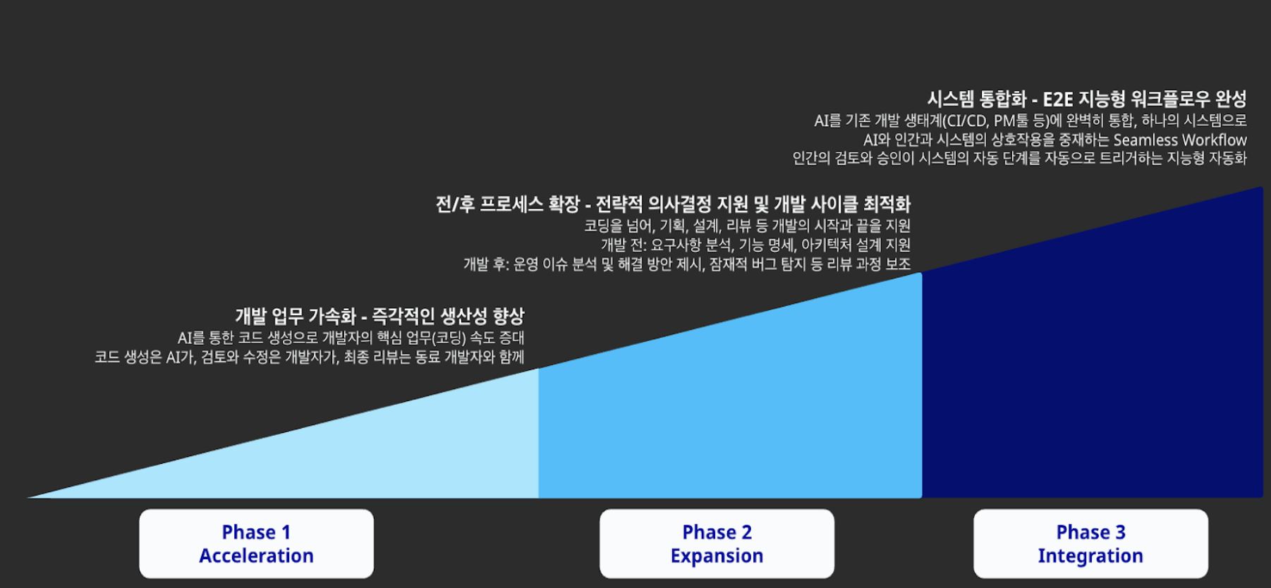 | 1단계: 개발 업무 가속화 (Acceleration) | 2단계: 전/후 프로세스 확장 (Expansion) | 3단계: 시스템 통합화 (Integration) |